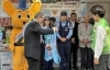 永福町駅からスタートした痴漢撲滅キャンペーン。高井戸警察署署長、防犯協会会長、そして鉄道警察と並んでご挨拶のピーボくん。