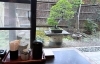大きな窓から望む中庭の緑や、盆栽が彩るテーブル席。