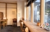 窓越しの木の温もりに包まれる一枚板のテーブル。座ると荷物置きのカゴを持ってきてくれます。