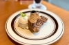 ホットケーキの上にはカスタード、バナナ、バニラアイスにナッツがちりばめられていてチョコレートソースは別添えです。